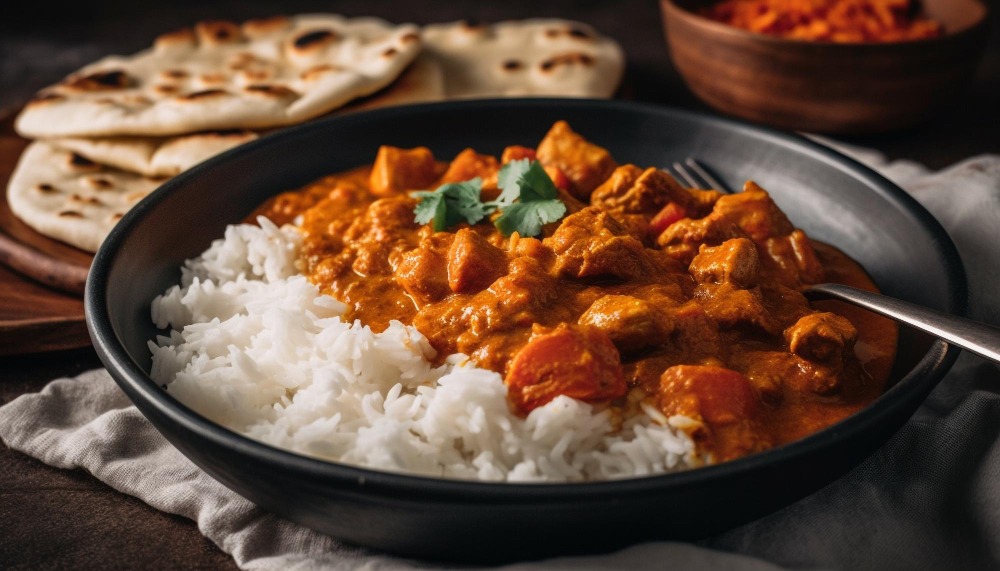 Butter chicken uses tandoori chicken cooked in a tandoor (a type of Indian oven) that gives the chicken, subsequently, a wonderful smoky flavor.