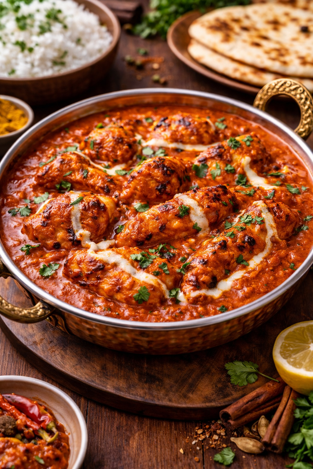 Tandoori-cooked halal chicken simmered in a rich, creamy tomato butter sauce with a perfect balance of sweetness and spice.